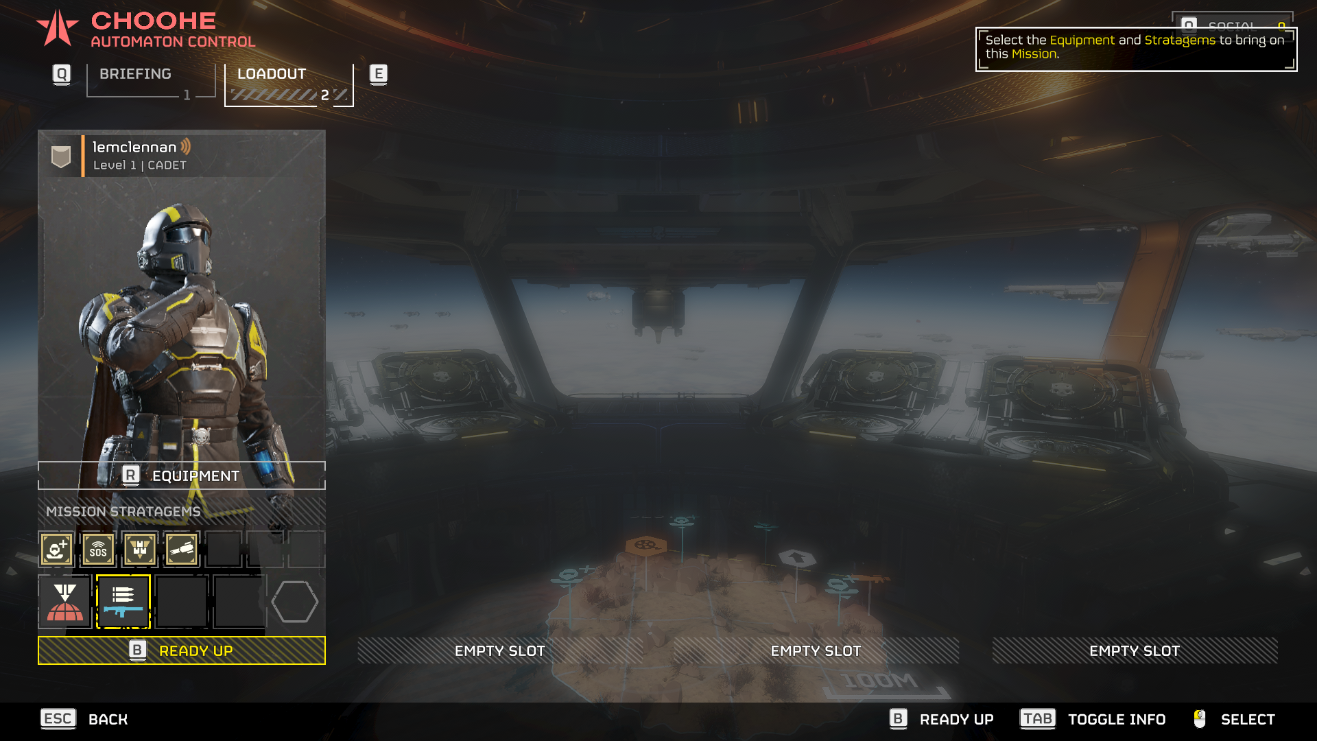 Pre-mission loadout screen with stratagems equipped