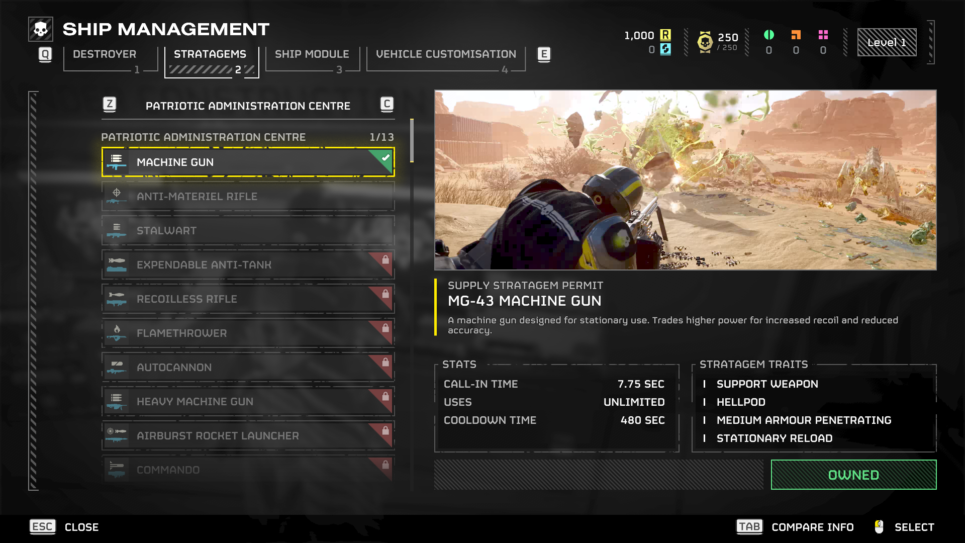 Stratagems screen showing the MG-43 Machine Gun supply stratagem with call-in time, uses and cooldown stats